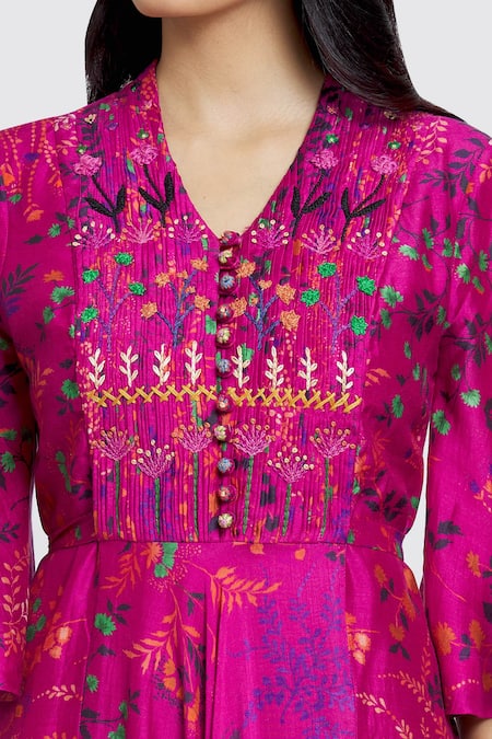 Magenta Cotton, Silk Embroidery Collared Pleated Bodice Dress