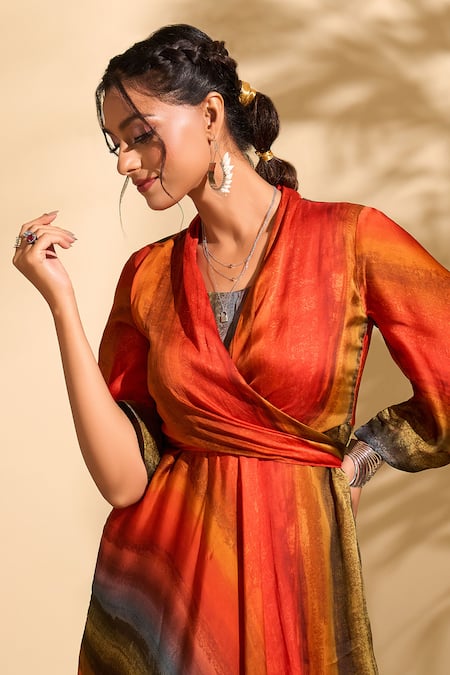 Red Organza, Satin V-neck Stroke Stripe Print Dress