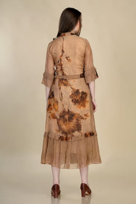 Gold midi dress featuring a waterlily print with frill details in an organza fabric