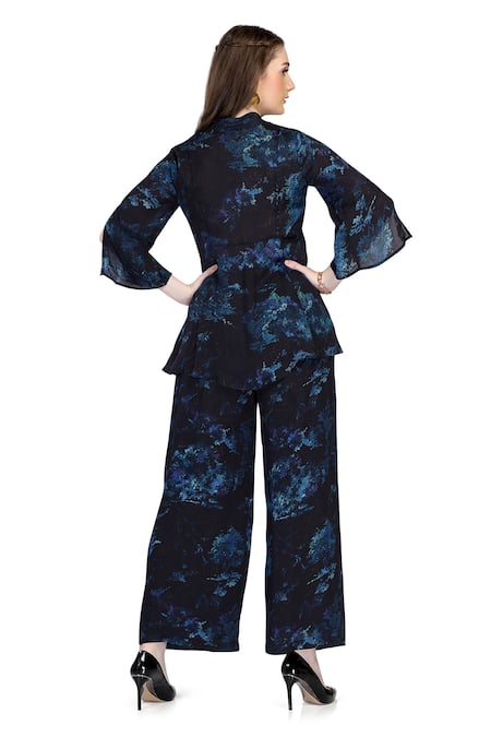 Blue wrap-over style top featuring a tree print and paired with matching printed pant. The ensemble is crafted from organza satin and has three-quarter sleeves with a V neckline.