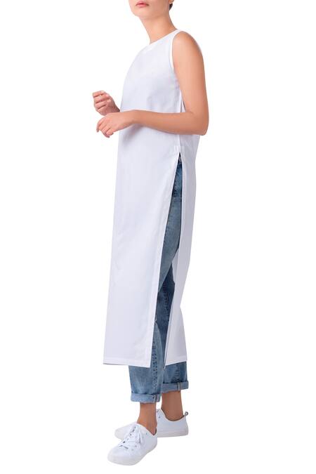 White plain sleeveless long kurta with side slits.
