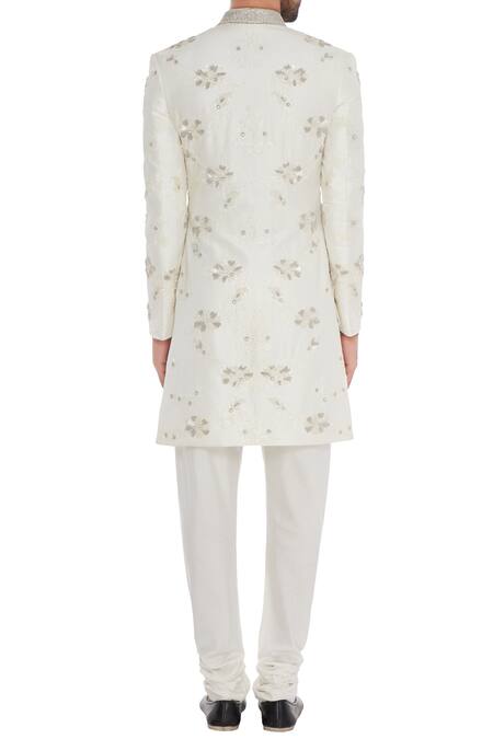Ivory sherwani with sequin and cutdana embroidered floral motifs. Comes with churidar.