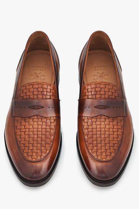 Dark brown slip on style loafers with tan basket weave motif with almond toe front.