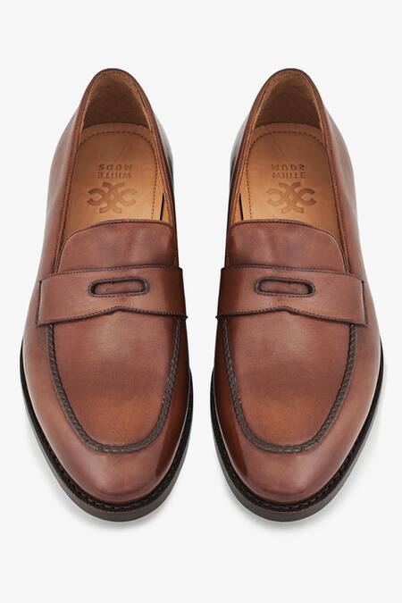 Brown shoes featuring round toe front, overlap panel, having elasticated inserts.