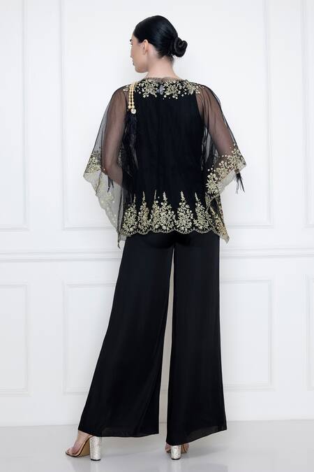 Black Cotton Satin And Net Thread V Neck Wide Legged Jumpsuit With Kaftan Top