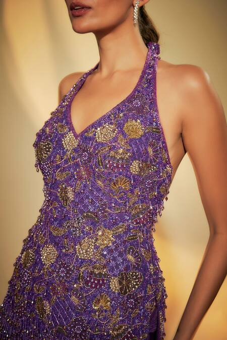 Purple Crepe Sequins, Cut Work Halter Neck Embroidered Sharara Set