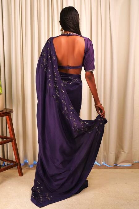 Purple silk saree with golden zari embroidery. Comes with embroidered unstitched blouse fabric.