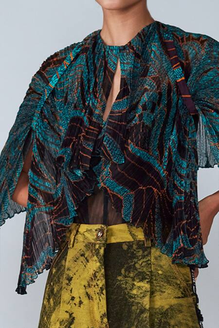 Turquoise winged cape with flower prints on a pleated base.