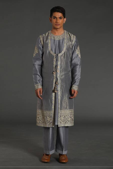 Grey angrakha jacket featuring floral dori embroidery and a front tassel tie-up. Paired with a matching aari embroidered kurta and pant.
