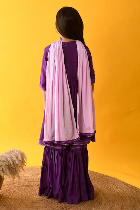 Purple muslin silk kurta featuring lace detailing on the neckline and sleeves. Paired with a flared sharara and lace dupatta.