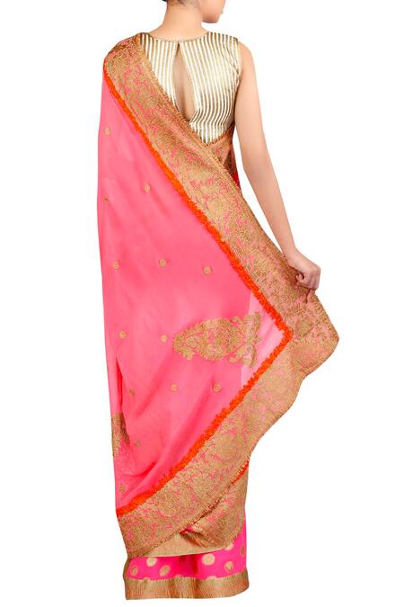 A perfect pick for the upcoming festive season, this pink georgette half and half saree with one half as woven polka and the other half has gold tissue appliqu . It is teamed up with gold ribboned off-white silk blouse.