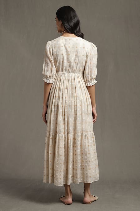 Beige Cotton Ruffles V-neck Geometric Woven Puff Sleeve Midi Dress