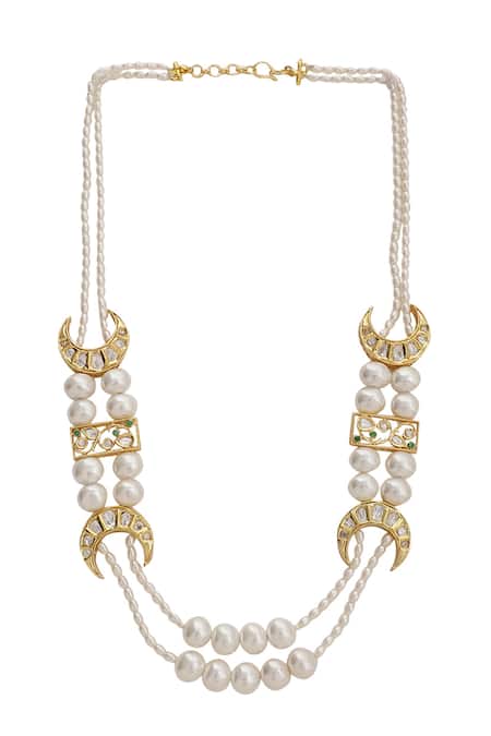 Flora kundan crescent embellishments, Layered pearl bead design, Gold plated detailing