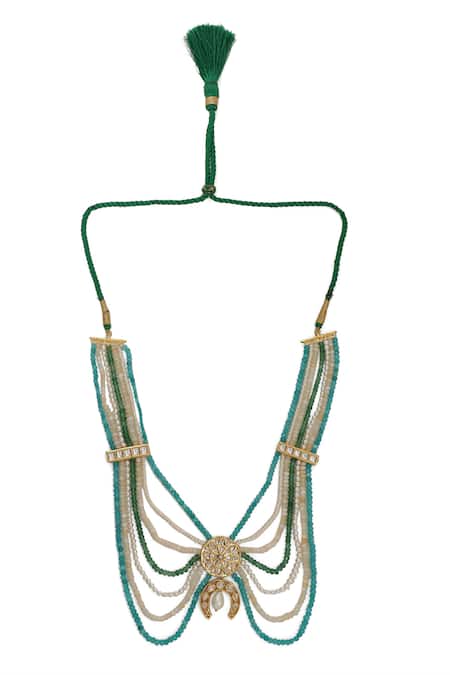 Crescent shaped kundan centerpiece, Multi colored bead layering, Soft tassel closure