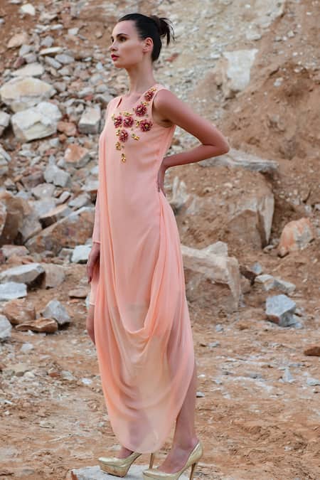 Peach Georgette Round 3d Embroidered Draped Tunic