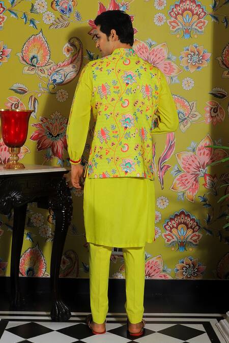 Yellow kurta featuring a side slit design and elasticated sleeve hems. Paired with a sleeveless bundi adorned with a vibrant bloom print and mandarin collar.