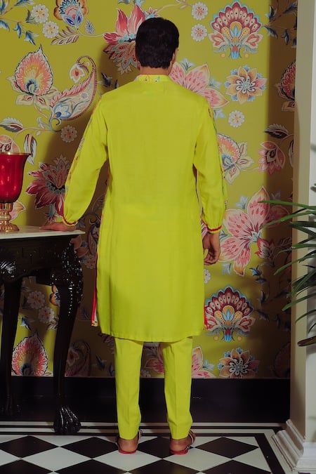 Lemon yellow kurta featuring a bloom print with a mandarin collar and full sleeves. Paired with matching trousers.
