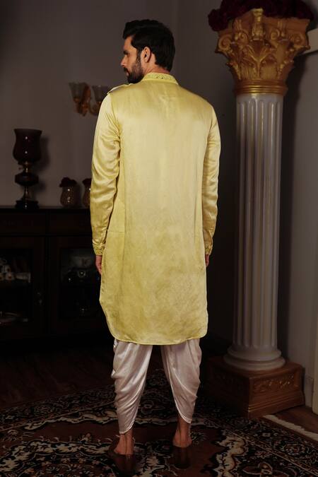 Lemon yellow pathani kurta with mirror embroidery and flap pockets in front. Comes with dhoti pants.