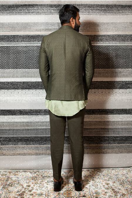 Olive green bandgala with tonal embroidery & front buttons. Paired with mint green short kurta & trouser.
