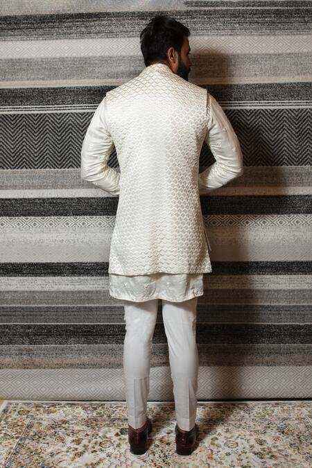Off white front open jacket with geometric embroidery. Paired with embroidered asymmetric kurta & pant.