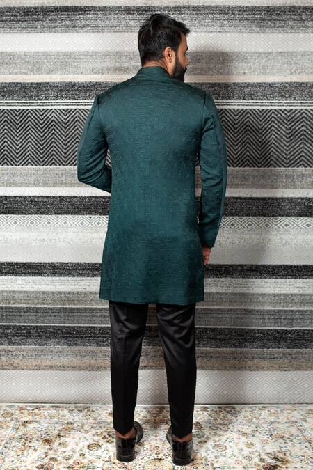 Bottle green jacket style sherwani with antique gold embroidered motif & layered detail. Paired with trouser.