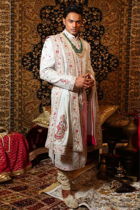 Pastel blue sherwani with zari and pink thread jaal embroidered motifs. Paired with churidar & heavy placement motifs on the dupatta.