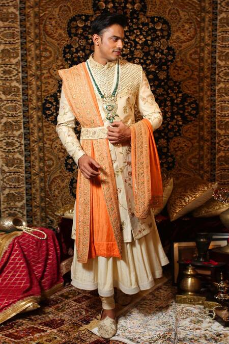 Ivory sherwani with golden embroidery with green leaves and red flowers. Paired with kali kurta, churidar, embroidered belt & embroidered contrast dupatta.