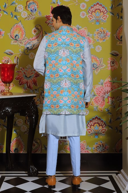 Blue floral printed kurta featuring a mandarin collar and full sleeves. Accompanied by a sleeveless bundi and trouser, both in a coordinating shade.