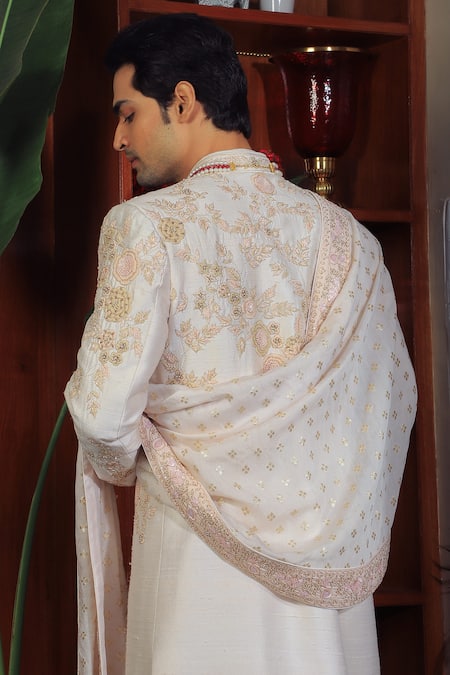 Off White Silk, Cotton Sequins, Embroidery Flower Sherwani Set