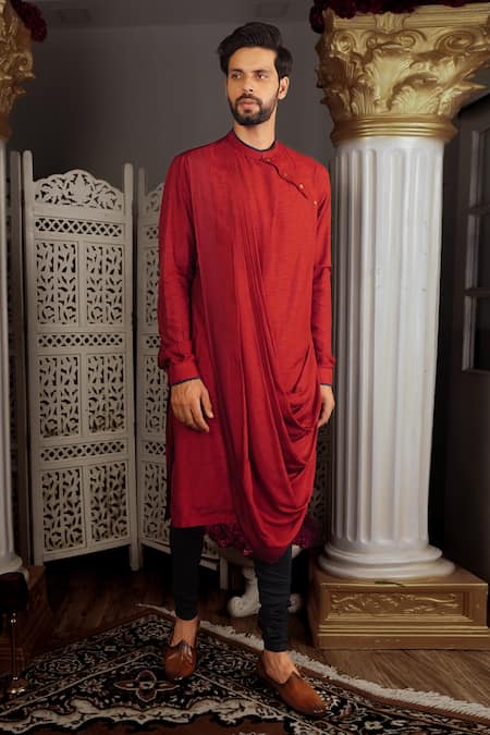 Cherry red kurta with cowl drape and stitchline embroidery. Comes with churidar.