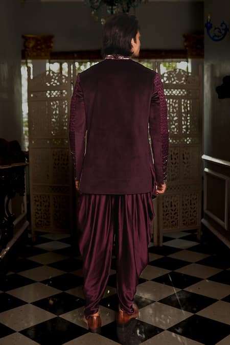 Purple Cowl Pant Satin Silk, Jacket Suede Kewat Embroidered Bandhgala And Set