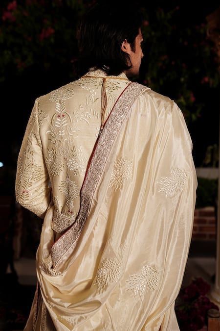 Butterscotch sherwani with resham, floral embroidery. Paired with kurta, churidar & dupatta.