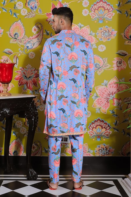 Blue kurta featuring long sleeves, mandarin collar, and lotus pond print. Paired with a printed trouser with zipper detail.