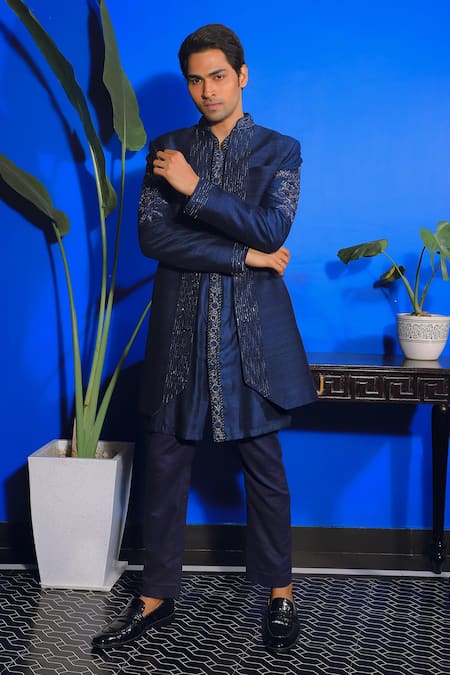 Blue jacket featuring midnight bloom embroidery and bead detailing on borders. Paired with a floral placket embroidered kurta and trouser.