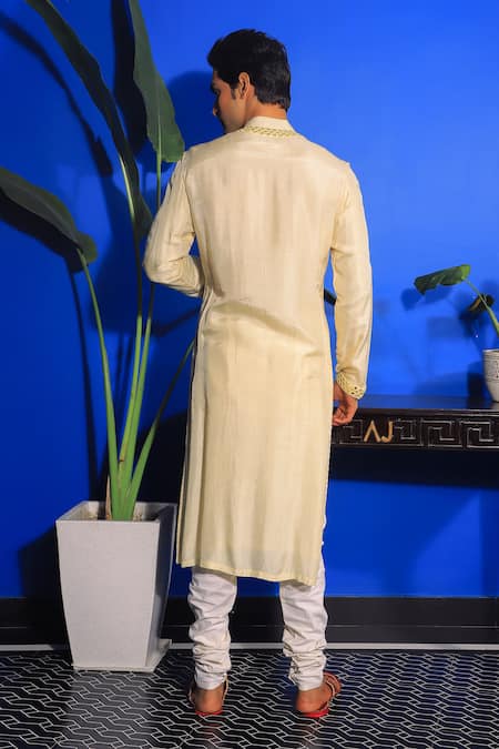 Yellow kurta featuring mirror embroidered placket and statement buttons. Paired with a white churidar.
