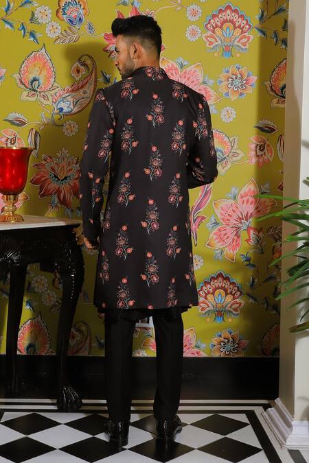 Black kurta set featuring a long sleeves wrap style jacket with rafflesia bloom print. Paired with a matching kurta and trouser, crafted in silk, stretch cotton, and suiting fabric.