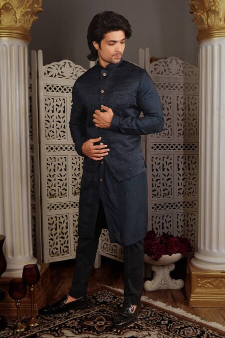 Midnight blue bundi with thread, floral embroidery. Paired with kurta & pant.