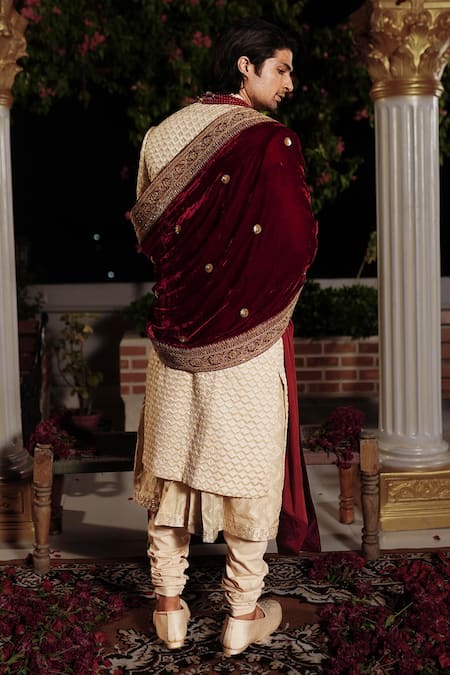 Ivory sherwani with geometric embroidery in moti highlights. Paired with kurta, churidar & dupatta.