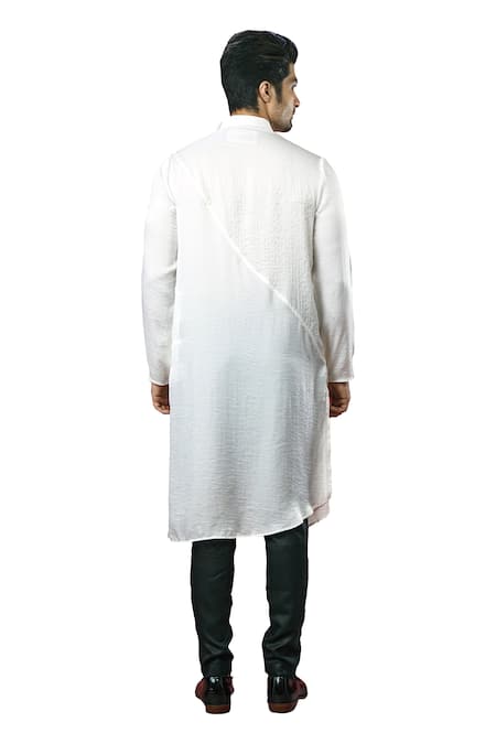 Off white kurta with pleated draped panel & asymmetric button placket. Paired with churidar.
