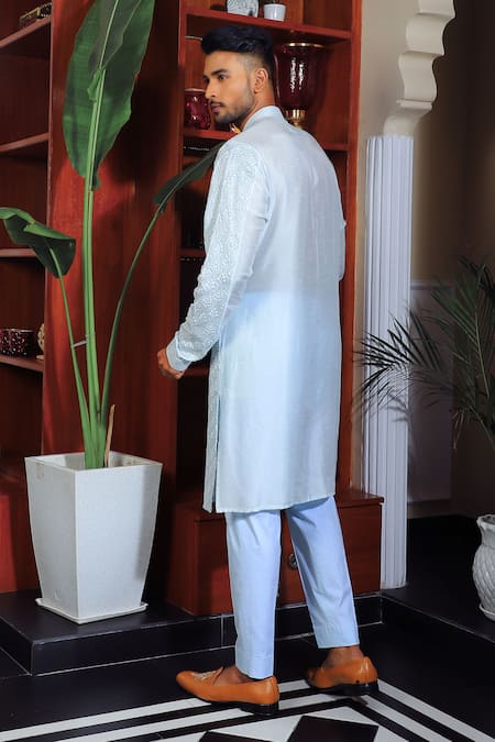Powder blue kurta featuring all-over thread embroidery and a band collar. Paired with matching powder blue trousers.