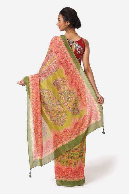 Green silk chanderi saree with printed floral motifs and tassel detail on pallu hem.