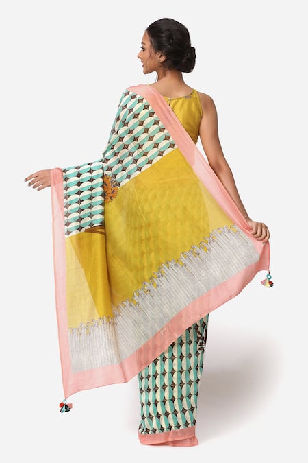 Blue silk chanderi saree with printed motifs and tassel detail on pallu hem.