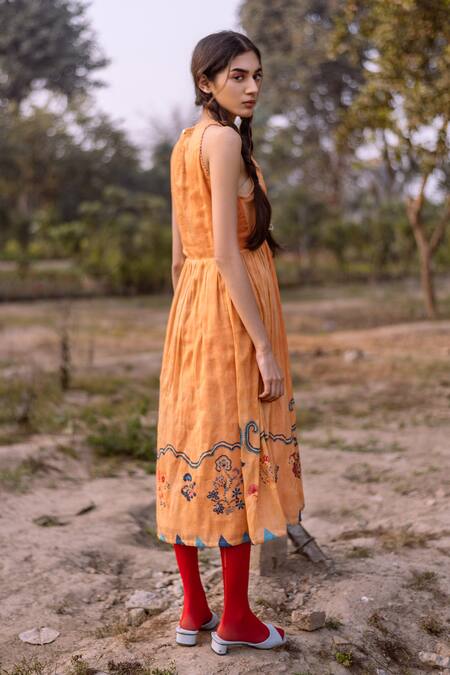 Yellow midi dress with hand painted floral motifs, organza panelled bodice & front gathers.