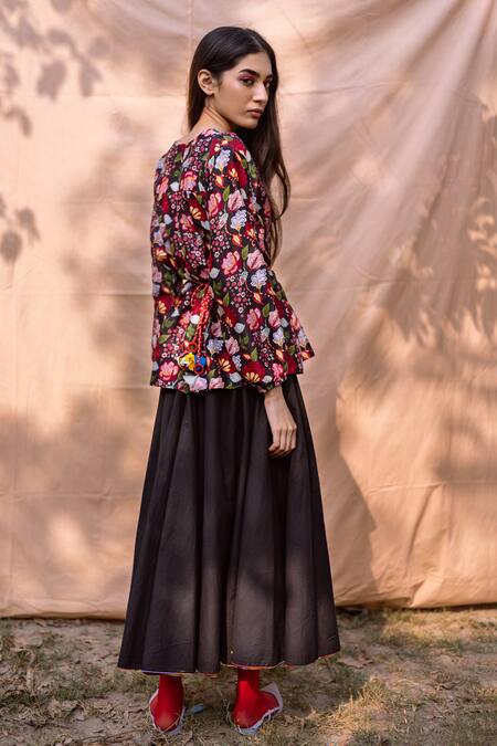 Black shirt with floral motifs, back tie-up & front button placket.