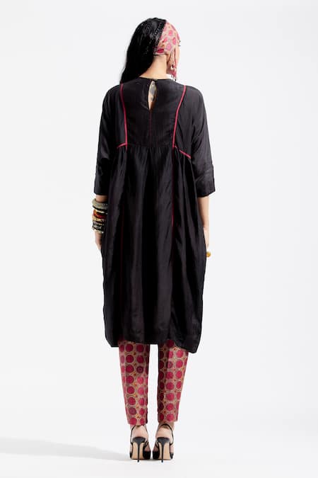 Black kurta with embroidered yoke, featuring resham thread embroidery with sequins, cowry shells and tassel embellishments and contrast seam inserts. Paired with printed narrow trouser.