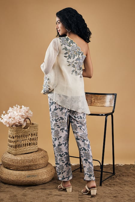 White one shoulder top featuring contrast floral and leaf pattern applique embroidery. Paired with floral and leaf pattern pant, both crafted from handloom net and linen.