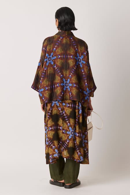 Brown Silk Collared Aardo Iris Print Shirt Dress
