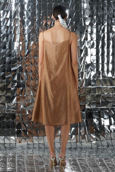 Copper slip dress with brocade woven motifs & V neckline.