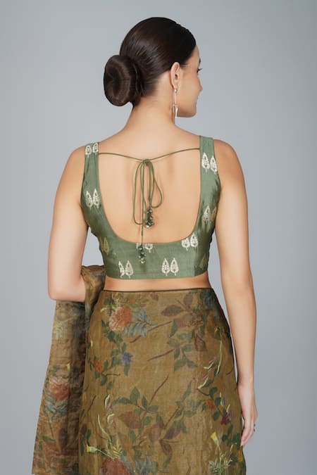 Green blouse with silk woven banarasi brocade floral motifs & decorated with intricate designs using zari.