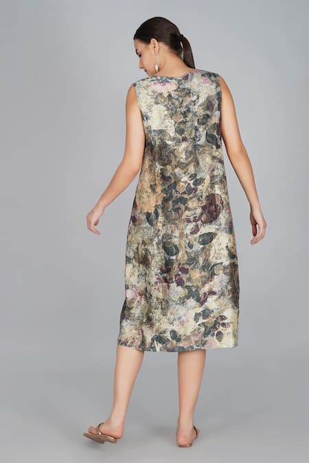 Multicolored midi dress with V-neck, painted brush strokes & brocade floral motifs woven with pure silk & zari yarns.